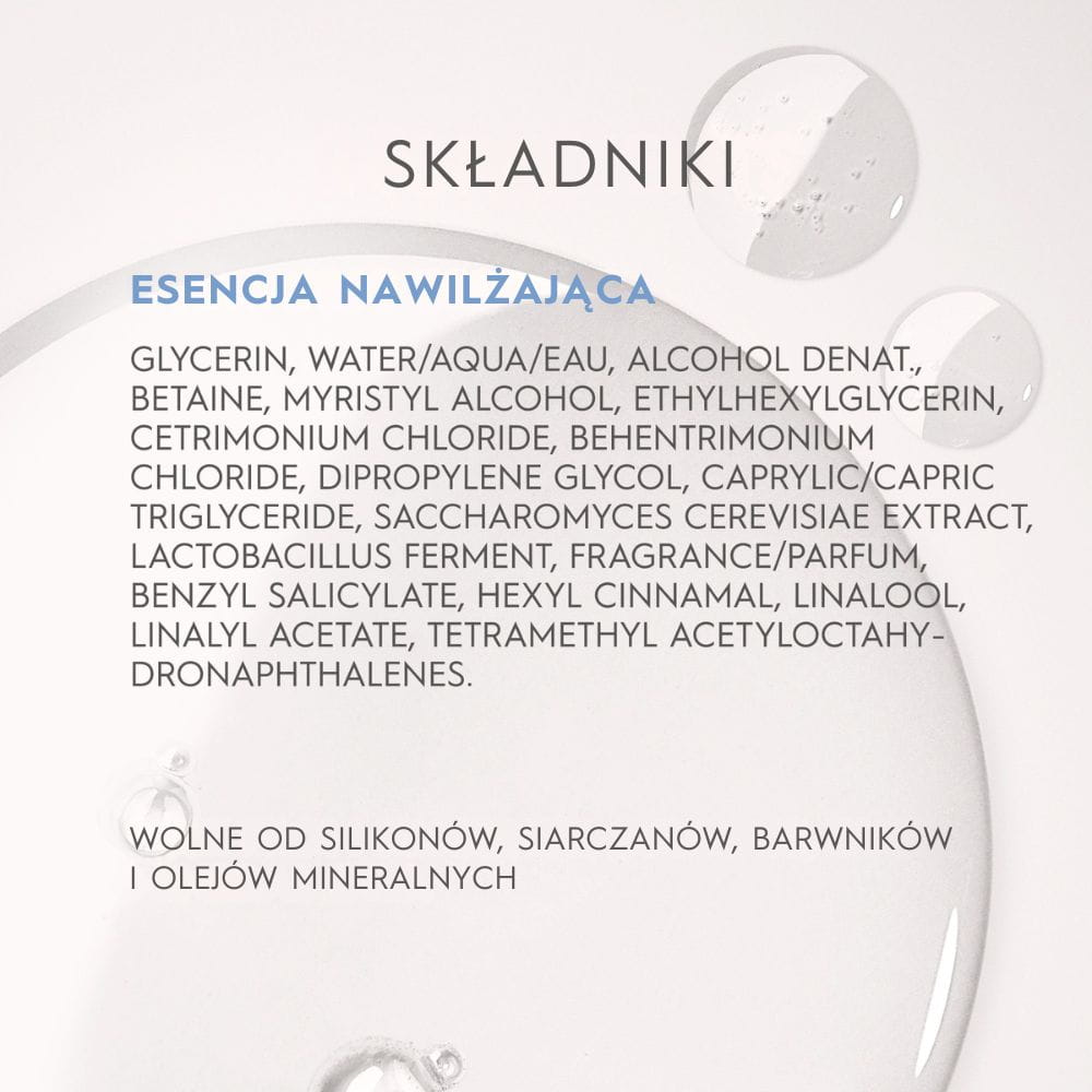 Kerasilk Specialists Hydrating Essence to intensywnie nawilżająca esencja stworzona z myślą o suchych, odwodnionych i osłabionych włosach. Już po pierwszym użyciu włosy stają się wyraźnie bardziej miękkie, elastyczne i pełne blasku, bez efektu obciążenia. Formuła zapewnia podwójną dawkę nawilżenia nawet bardzo suchym pasmom, jednocześnie pomagając ograniczyć łamliwość włosów i rozdwajanie końcówek. Dzięki połączeniu biomimetycznego jedwabiu i betainy esencja tworzy na włosach ochronną warstwę, która zatrzymuje wilgoć i przywraca im zdrowy wygląd.