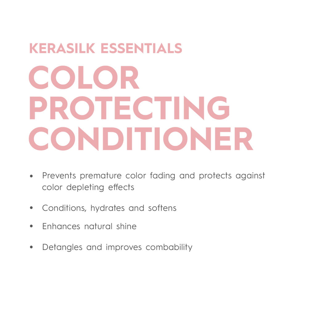 Odżywka Kerasilk Essentials Color Protecting Conditioner doskonale pielęgnuje włosy, przywracając im miękkość, nawilżenie i zdrowy połysk. Odżywka stworzona specjalnie dla włosów farbowanych i rozjaśnianych.Wzmacnia włókna, chroni przed przesuszeniem i uszkodzeniami mechanicznymi, a jednocześnie wygładza ich powierzchnię. Dzięki temu włosy stają się jedwabiste w dotyku, bardziej elastyczne i znacznie łatwiejsze do rozczesywania oraz stylizacji.