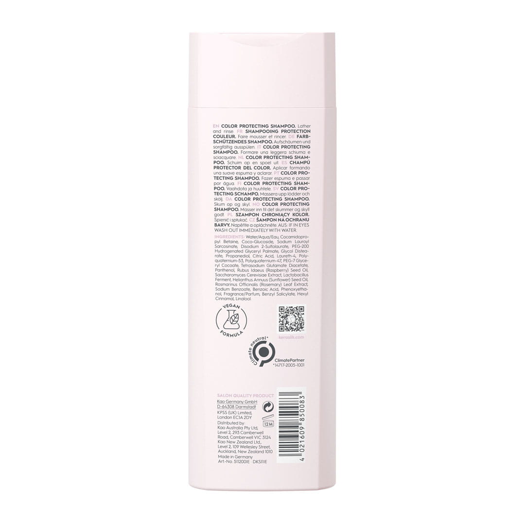 Kerasilk Essentials Color Protecting Shampoo to delikatny szampon stworzony specjalnie dla włosów farbowanych i rozjaśnianych. Dzięki innowacyjnej formule z jedwabiem biomimetycznym i olejem z nasion malin skutecznie chroni kolor przed blaknięciem, jednocześnie zapewniając intensywne nawilżenie i zdrowy połysk. Jego wegańska, wolna od siarczanów i silikonów formuła oczyszcza włosy, zachowując ich intensywny kolor i miękkość.