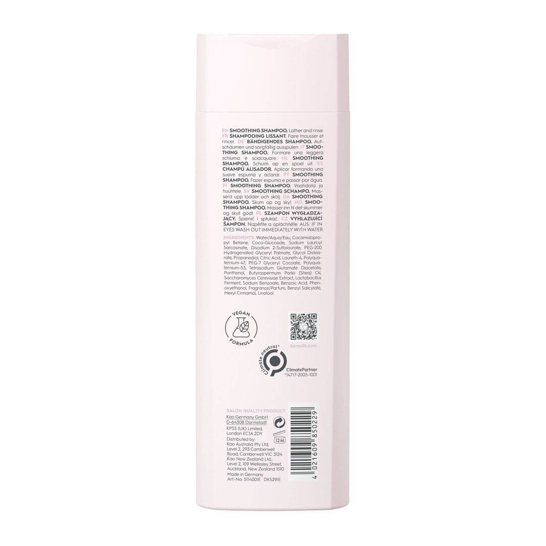 Zakończ codzienną walkę z niesfornymi, szorstkimi włosami. Kerasilk Essentials Smoothing Shampoo sprawi, że Twoje pasma staną się jedwabiście gładkie i wolne od puszenia. Formuła z odżywczym olejkiem shea wygładza strukturę włosów, nadając im miękkość, blask i zdrowy wygląd. Po użyciu włosy stają się bardziej podatne na stylizację, a ich układanie zajmuje znacznie mniej czasu.
