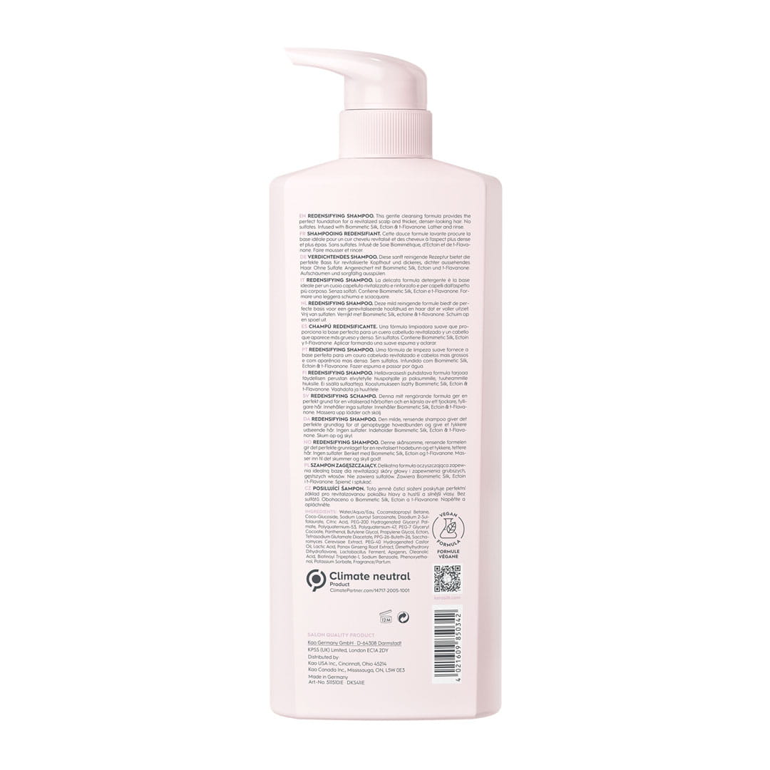 Kerasilk Essentials Redensifying Shampoo to delikatny preparat oczyszczający, stworzony specjalnie dla osób z przerzedzonymi i osłabionymi włosami. Dzięki zaawansowanej formule wzbogaconej o jedwab biomimetyczny, ektoinę i T-Flavanone, szampon wspomaga stymulację skóry głowy, nadając włosom pełniejszy, grubszy i zdrowszy wygląd od nasady. Jego 100% wegańska formuła stanowi doskonałą bazę dla odnowionej skóry głowy i gęstszych włosów.