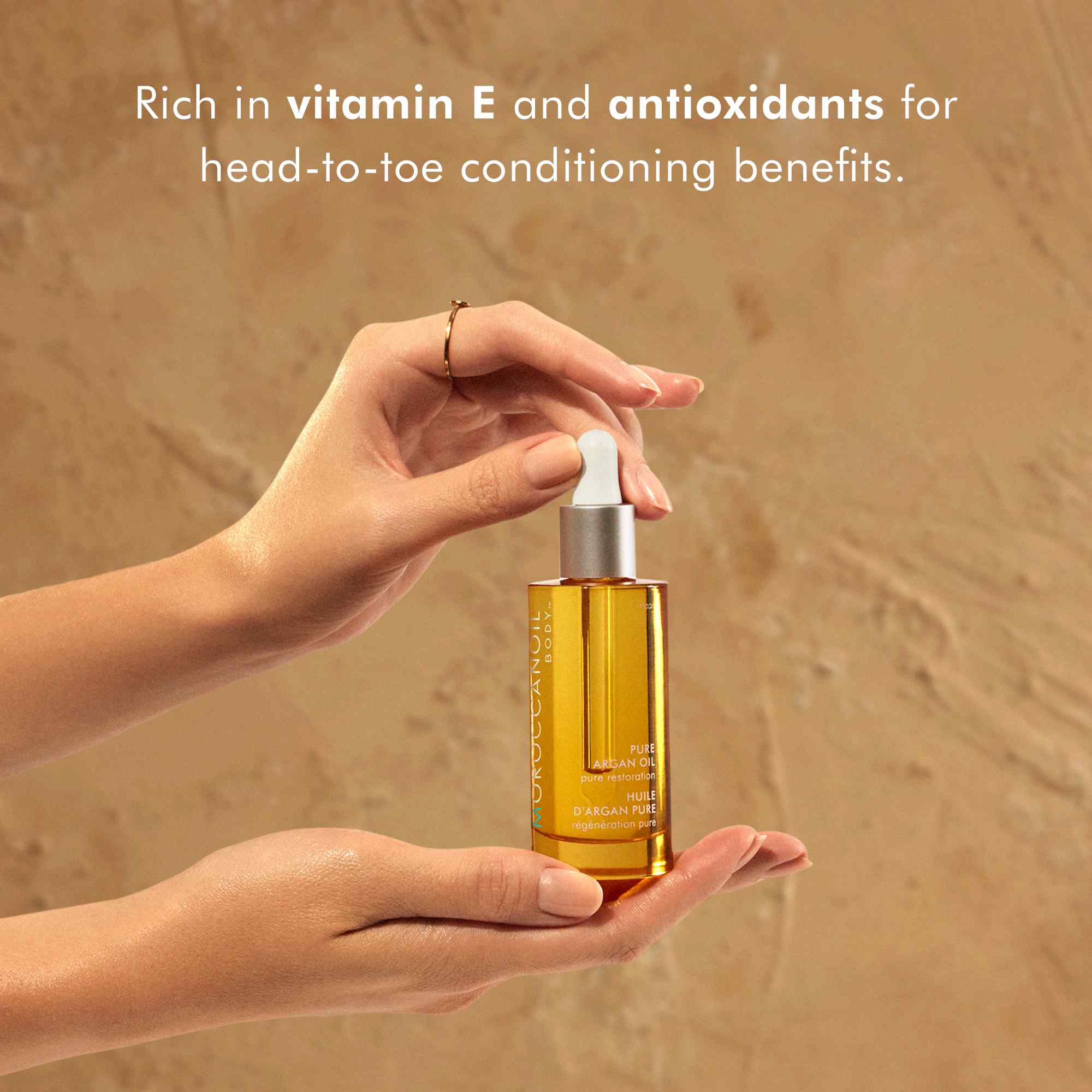 - 100% czysty olej arganowy - bogaty w witaminę E, nienasycone kwasy tłuszczowe i przeciwutleniacze, intensywnie nawilża, chroni przed utratą wilgoci i wspiera naturalne procesy regeneracyjne skóry i włosów