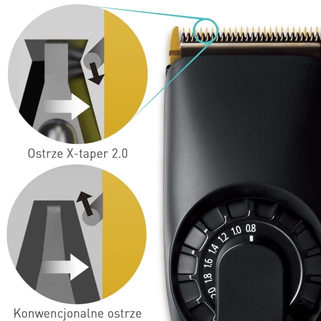 - ostrze X-taper 2.0 gwarantuje dokładne cięcie, minimalizując przesuwanie się włosów