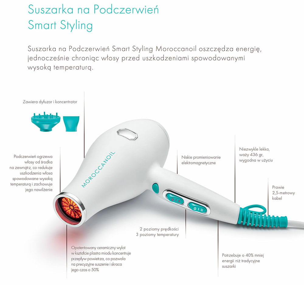 Poznaj Moroccanoil Smart Styling Infrared Hair Dryer, lekką suszarkę zaprojektowaną z myślą o szybkim, skutecznym i jednocześnie delikatnym suszeniu włosów każdego rodzaju. Dzięki innowacyjnej technologii podczerwieni oraz ceramicznemu wylotowi w kształcie plastra miodu, suszarka równomiernie ogrzewa włosy od środka na zewnątrz, minimalizując ryzyko ich uszkodzeń i zachowując naturalne nawilżenie. Doskonała do codziennego użytkowania w domu, pozwala uzyskać efekt fryzury jak z profesjonalnego salonu w znacznie krótszym czasie.