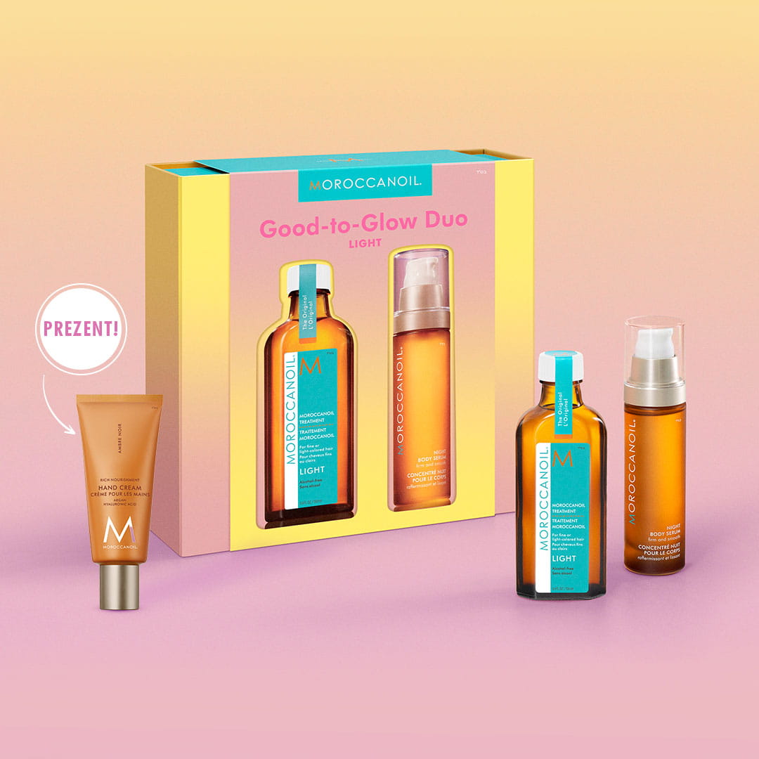Dodaj Twoim włosom i ciału zdrowego blasku oraz miękkości! Wybierz zestaw Morocannoil Good to Glow Light i otrzymaj dwa kremy do rąk w prezencie.