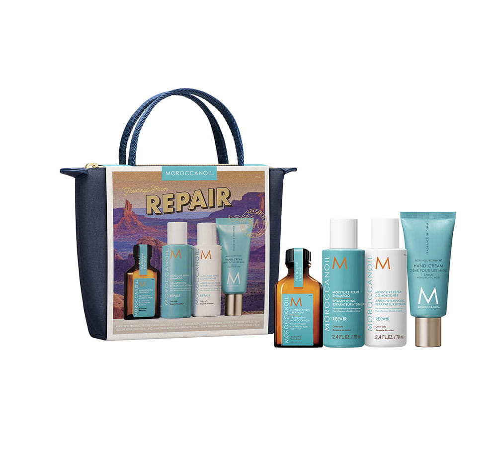 Limitowany zestaw zawierający 3 popularne produkty w wersji podróżnej z linii odbudowującej oraz Krem do rąk o kultowym zapachu Moroccanoil.